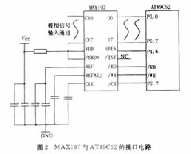 数据采集和A/D转换由MAX197完成。MAX197是MAXIM公司出品的高性能12位A/D转换器,8通道模拟信号输入,可以满足使用1片A/D分时进行多参数测量的要求。MAX197的其中2路通道为电池重量信号的输入,由压力传感器获取原始信号经运算放大后输入。其余6路分别为电池相关电压、电流各参数信号的输入。MAX197片选信号/CS接AT89C52的P2.7,读写控制信号分别接AT89C52的/WR和/RD。引脚HBEN为12位转换结果选择端,由P1.6控制。当HBEN为高电平,读取转换结果的高4位;当HBEN低电平时读取低8位。设定MAX197的控制字为01000000B,则其工作方式为正常工作方式/内部时钟;内部获取方式;模拟量输入范围为0~5 V;使用通道0。改变控制字的最后3位(000~111)可以依次选取MAX197的第0~7通道。MAX197通过片内的三态并行接口与AT89C52进行接口。由于MAX197本身的转换时间较短,且为固定值,故而在设计时采用了固定延时的方式代替中断方式,进行转换结果的读取,提高了数据的通过率和程序的效率。图2给出了MAX197与AT89C52的接口电路。